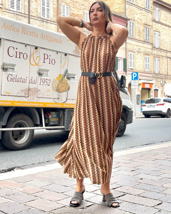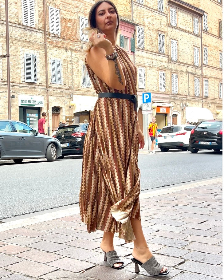 Abito plissè in fantasia simil Missoni, con trama di lurex oro, taglia unica, morbido